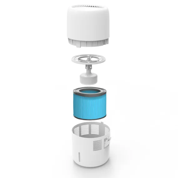 Якщо зняти верхню частину приладу, можна побачити вентилятор. На вентилятор встановлюється спеціальний зволожуючий фільтр (губка), у піддон заливається вода, і губка постійно підживлюється вологою з піддону, вентилятор обертається і постійно зволожує повітря яке проходить через губку, до слова це додаткове очищення повітря, тобто повітря заходить з нижньої частини зволожувача і вже зволожене і очищене виходить з верхньої.